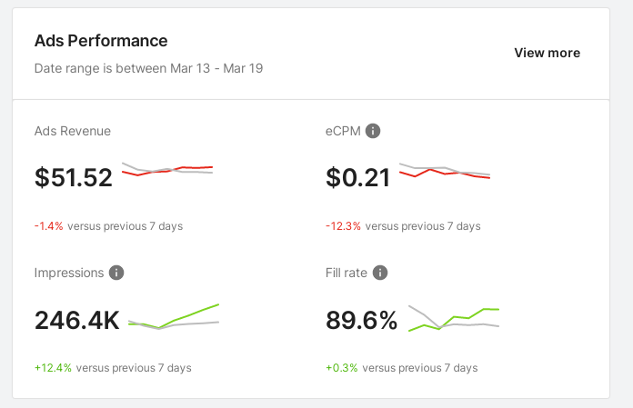 I can also see that the majority of your impressions are originating from the RU region. This region currently has a very low overall eCPM and as such is dragging down your eCPM.