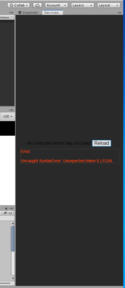 When I turn on Ads in the services window i get the following error. “An unknown error has occured(reload button)” " Error: Uncaught Syntax Error: Unexpected token ILLEGAL". Im using unity version 2019.2.12f1.