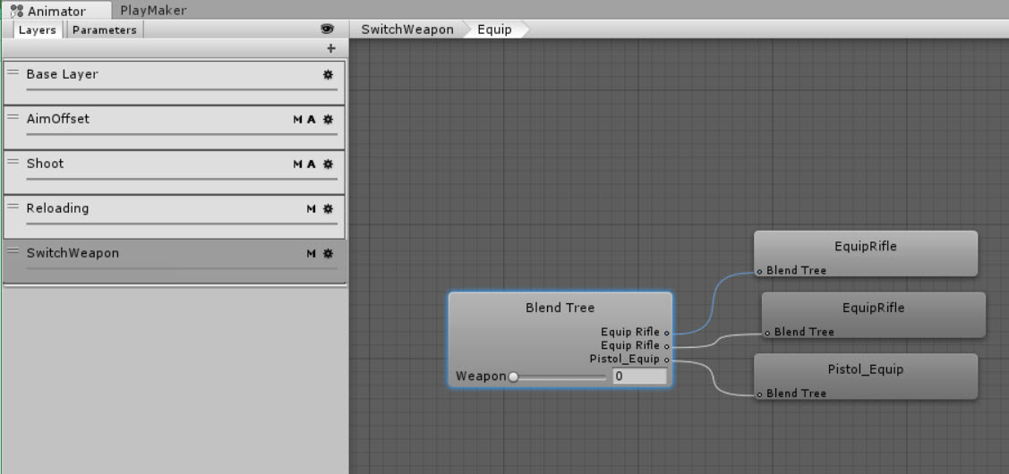 We will create one for every weapon and replace the animations that are used in both the āArmed Relaxedā & āArmed Aimā Layers with the new weaponās animations.