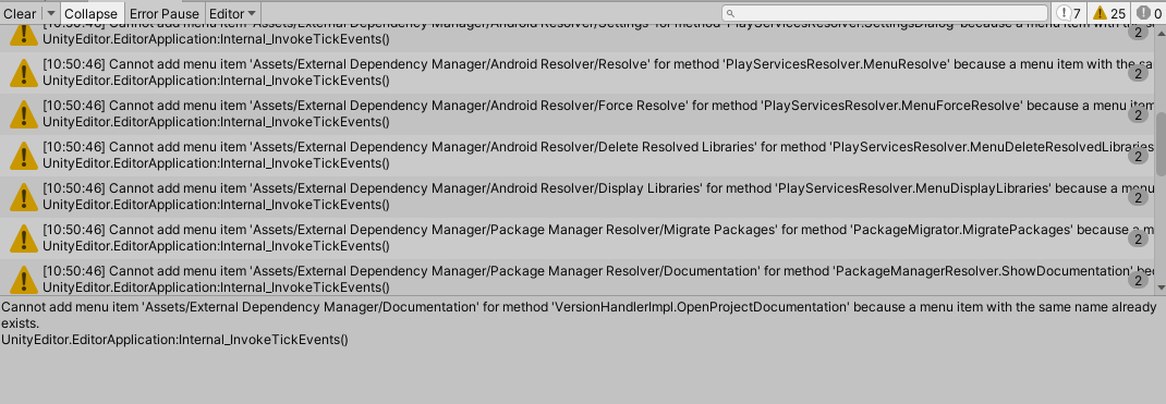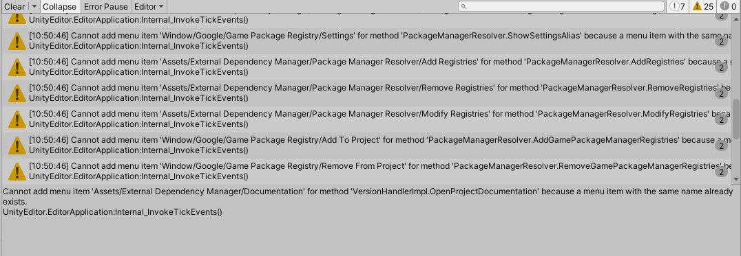 Cannot add menu item 'Assets/External Dependency Manager/Version Handler/Update' for method .....