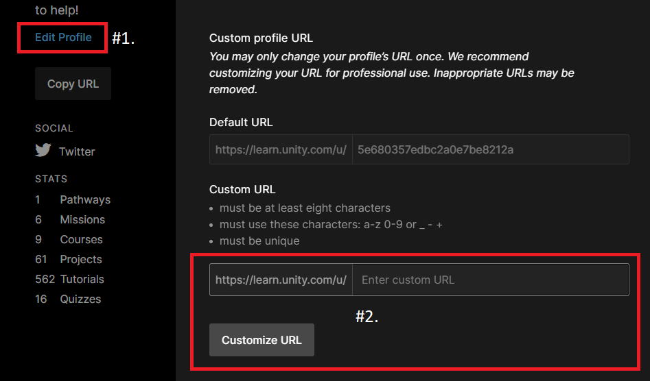 You can update their current, random numeric URL to a minimum 8-character URL of their choice exactly once. Find this feature by going to Learn, selecting the My Learning dashboard, and then going to the Profile tab. Once there, (#1.) click Edit Profile, and then scrolling down in the overlay to (#2.) the Custom Profile URL section.