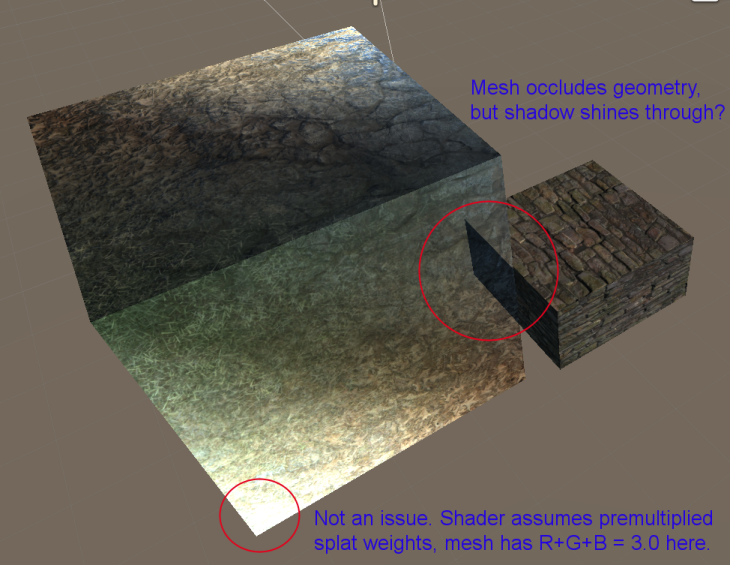 I’m trying to create a PBL shader that uses vertex colors to control texture splatting. I’ve got the blending working, but my shader is letting shadows shine through solid geometry somehow: