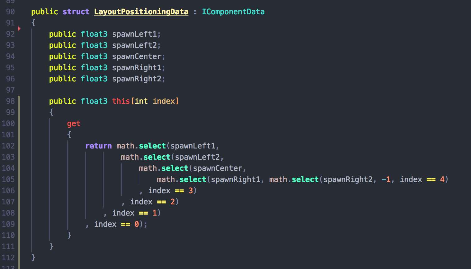 IComponentData? If I can do that I might not need all thatmath.selectand maybe have some ways to map integer to the correct data. Fixed length is fine, and that would be still in IComponentData’s design. Kind of like this :