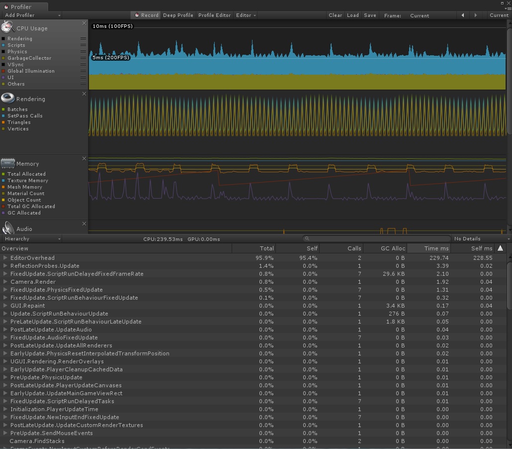 Here is a grab of the Editor Profiler, very simple scene, single skinned character, and a few rigid body objects, not moving.