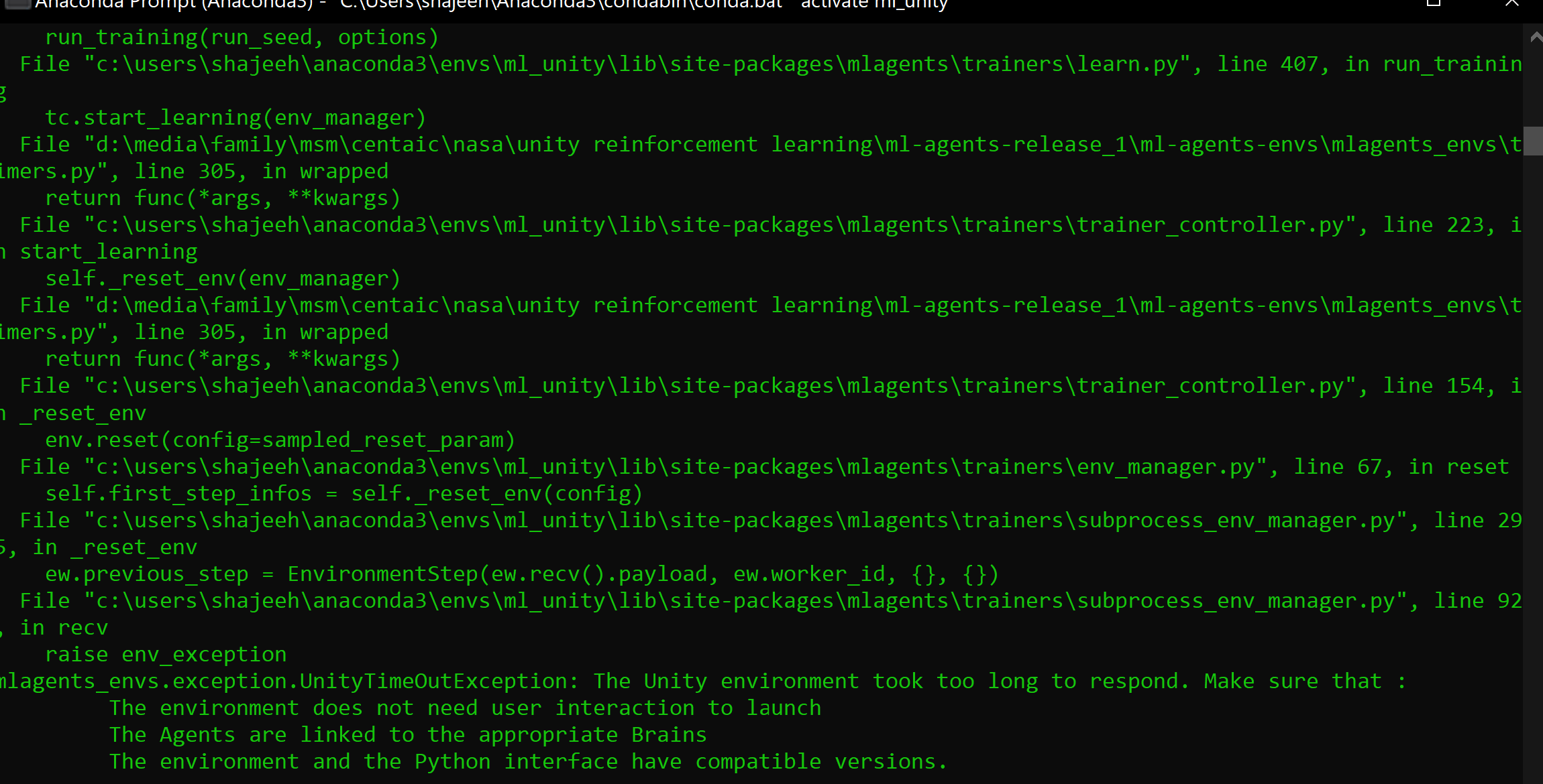 Lastly when I run the python shell command for training, it says press the play button (As usual). After pressing play button in unity, it says connected (screenshot attached). And then the game starts to take actions (at a very fast pace as compared to normal play rate) but terminal does not show anything. After some time terminal gives error that environment took too long to respond.