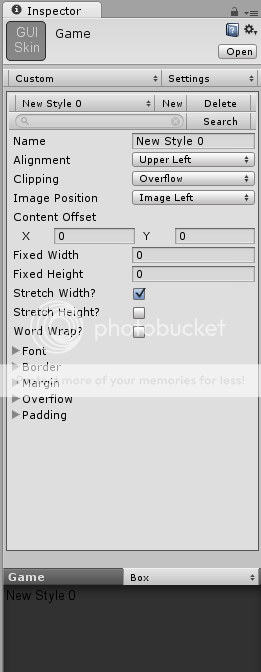 Settings panel, a GUIStyle to edit, or the Custom Styles Panel. The second popup