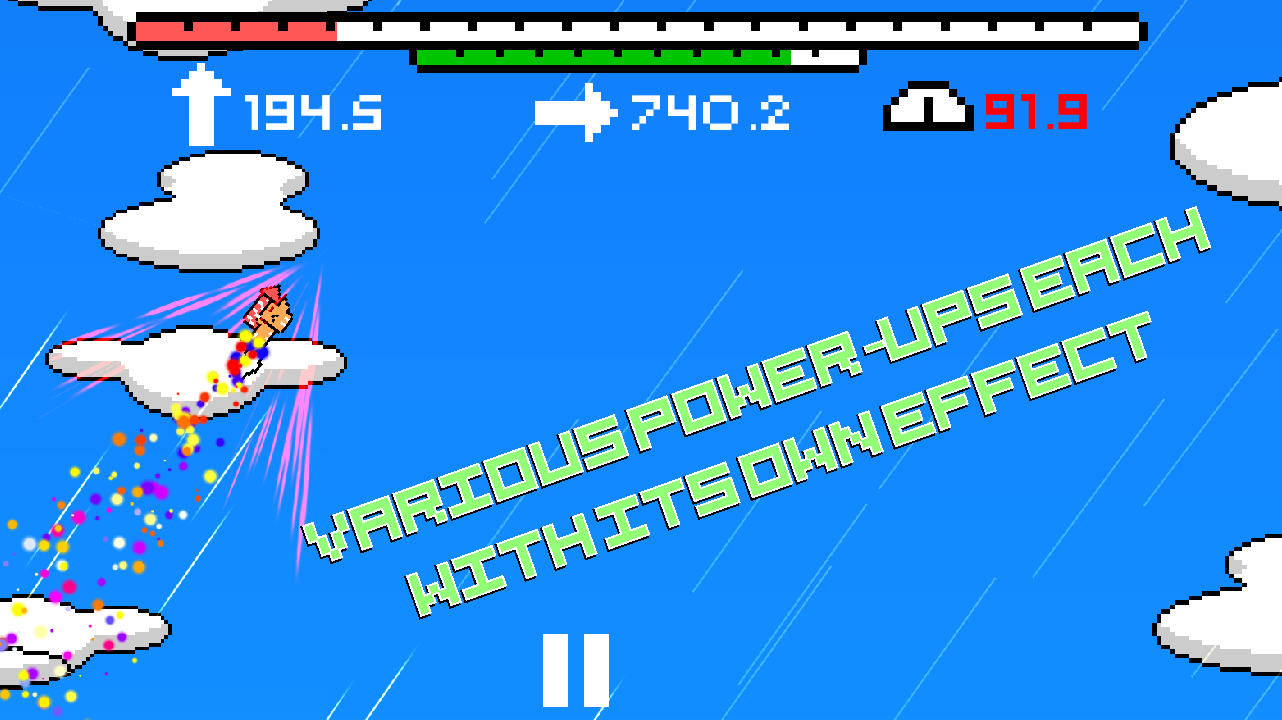 Kitty Can Fly makes use of a multitude of power-ups designed to keep Kitty flying! Use the bouncy bubble to ricochet off the ground and back into the stratosphere. Or fly through the rainbow for a massive boost in speed and distance!
