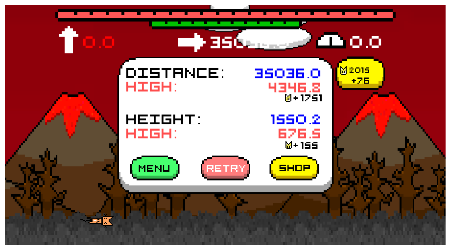 As for the high score lines, yes! Took your advice and made a “high distance” line and a “high height” line. If either one is broken during gameplay then you get a “NEW RECORD” notification when the round is over. Thanks for the awesome idea!