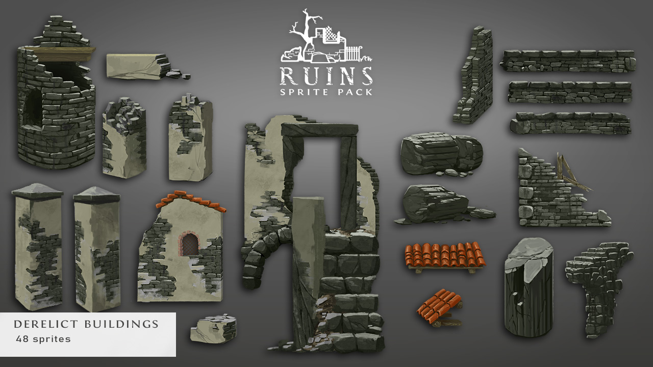 Ruins Sprite Pack is perfect for HD sidescrollers and platformers. With this package you’re able to create countless ruins scenes and levels by combining a selection of hand painted sprites and objects crafted to be able to blend together in many combinations of sizes and orientations.