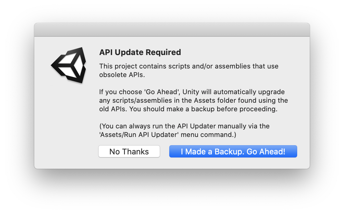 Hey, I hope you can help me. I’m getting the “API Update Required” dialog box every time I open my project.