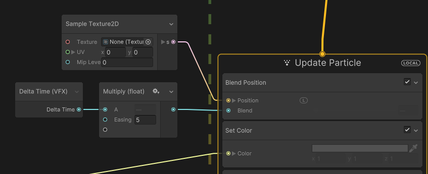 At the start of the frame you: 1. Set the particle position 2. Add a force to the velocity attribute, this block does velocity += (Force / mass) * deltaTime; 3. At the end of each Update, there’s an implicit block (Integration: Update Position) which does the following: position += velocity * deltaTime;