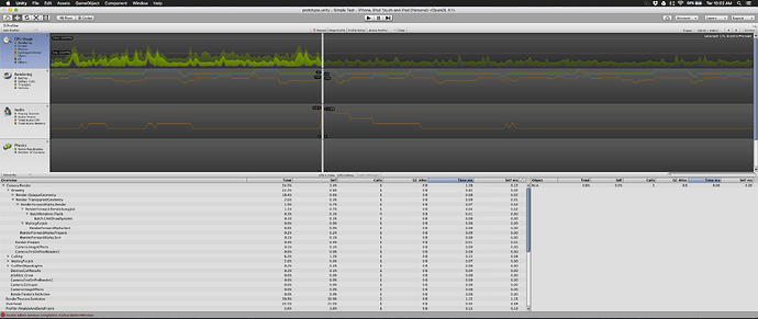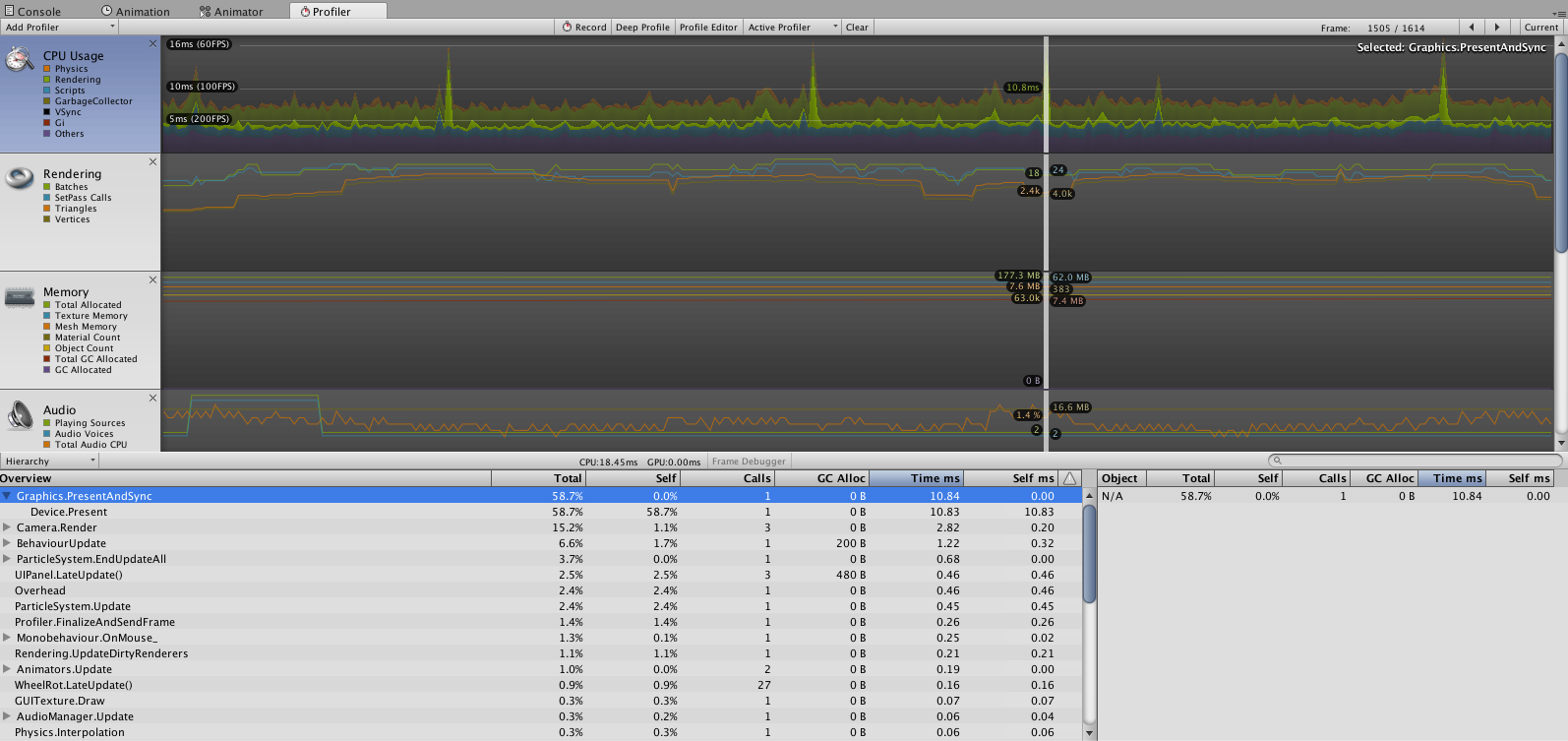 Notice that on the image that game execution time take less than 10ms (100FPS), which is great. Although these Graphics.PresentAndSync peaks makes gameplay unplayable.
