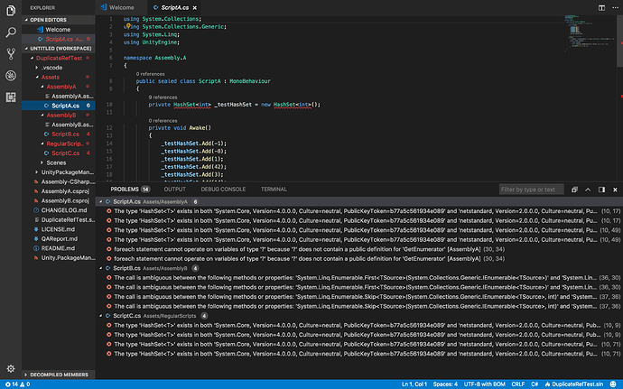 When you compile in VS or look at the “problems” log in VS Code, you get “Type X exists in both System.Core and netstandard errors” and “call is ambiguous between” errors, especially if you’re using certain Linq functions. I’ve tested this across 3 machines so far, 1 Macbook Pro and 2 workstation PCs, with similar results. Mono/IL2CPP mode doesn’t seem to affect this at all.