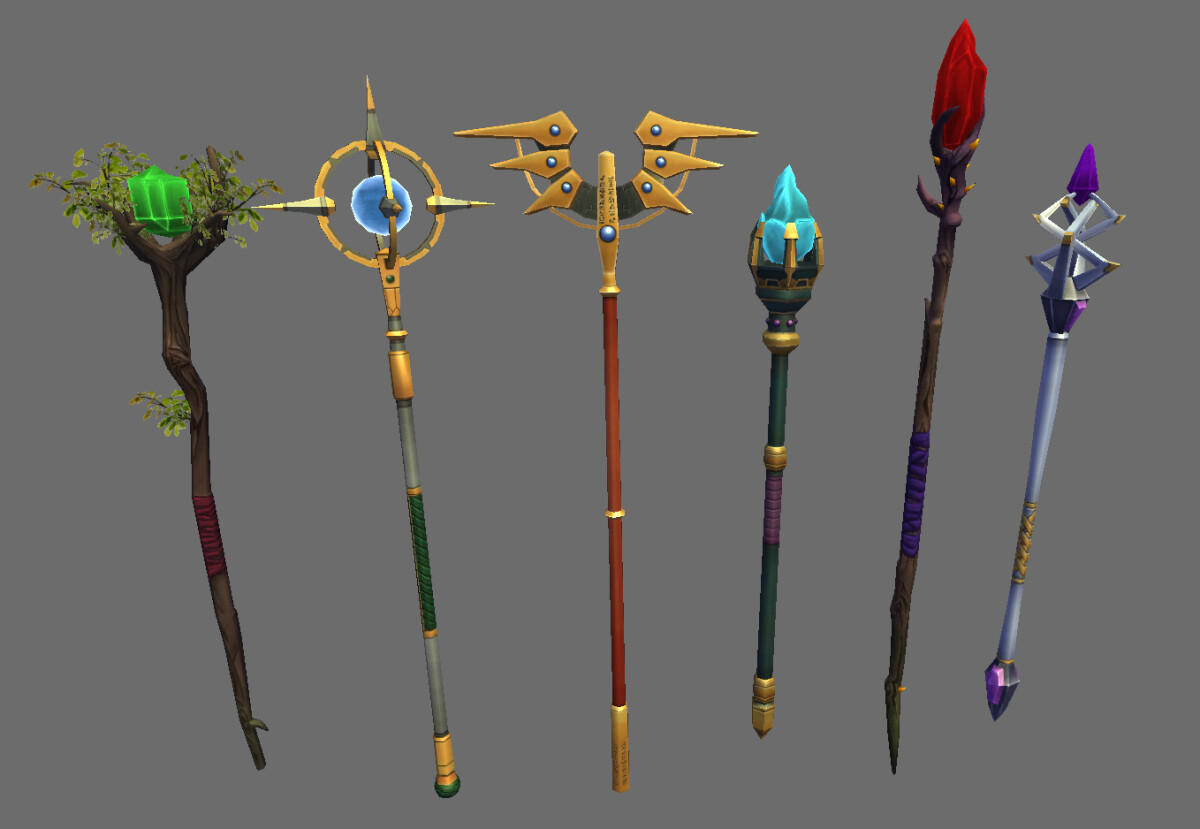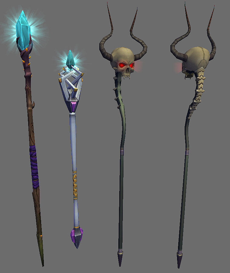 All staff use a diffuse, specular and selfillumination tintable shader for the crystals. The tri count varies from 500-1000ish. The texture sizes are all 512 for the staff and 256 for the crystals.
