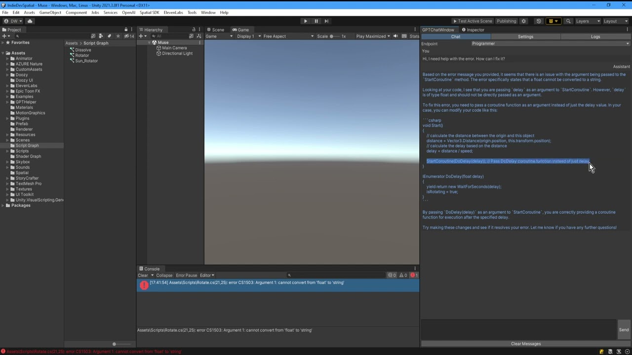 I find it weird that the people at Unity created a Web-based version of ChatGPT rather than directly integrating it as an editor window. I think that Muse would be magnitudes better in the Unity editor as it can gain context of a project’s files.