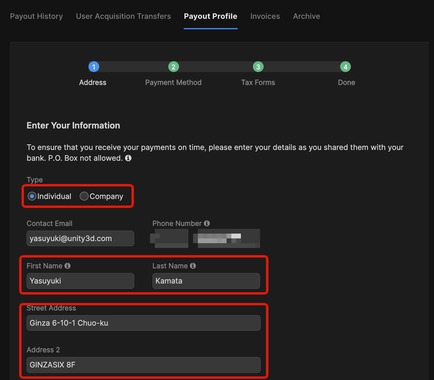 Type, name, and address in Payout Profile are not able to be edited so far.