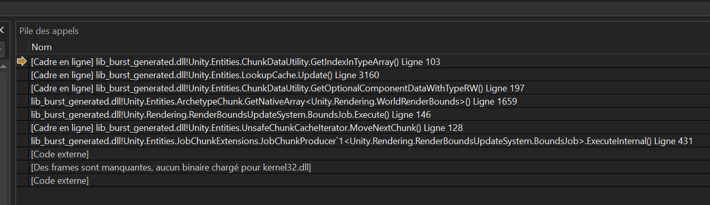 I’m encountering a rare and random crash in the Entities Graphics systems in build. The crash occurs when jobs are invoking Unity.Entities.ArchetypeChunk.GetNativeArray. It seems to be most frequent in RenderBoundsUpdateSystem, but I’ve also observed it in MatrixPreviousInitializationSystem and within the FrustrumCullingJob.