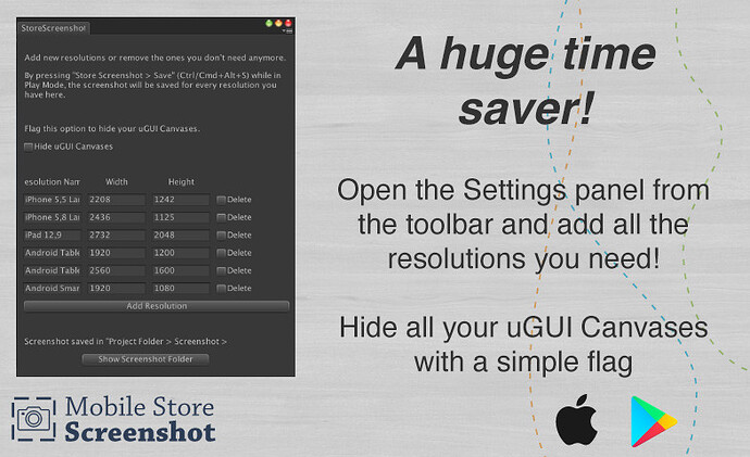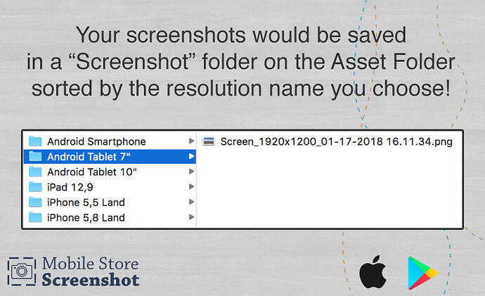Just go to the Settings panel and easily add all the resolution you need first. By saving the screenshot you will find all your generated images in a “Screenshot” folder on your project main folder!