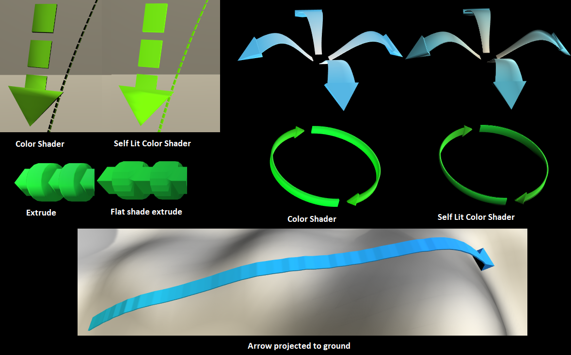 New version has been submitted. Arrows can now use path arrays which enables them to be projected on ground like selection circles. Added a shader that is much brighter and it is not effected by light. Fixed normals on all shapes. Added a flat shade extrude for arrows.