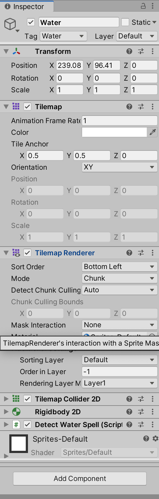 Could you share the settings for your GameObjects with screenshots of the Collider2Ds and other Physics2D Components for the Spell of player and water GameObjects?