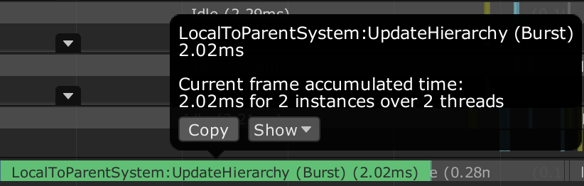 I’ve been doing some work on my new animation system called “Kinemation” this weekend. I wanted to experiment with a technique that involves keeping all bones in the hierarchy since that can be a convenient representation for game logic. However, it was nearly impossible to profile the GPU uploads because LocalToParentSystem.UpdateHierarchy was too slow. I have 29,200 skeletons (the max I stuff into a compute buffer) and the hierarchy update was taking a full 16 ms on my machine.