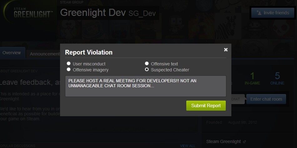 Hey all, not sure how many of you got notice of a Steam Greenlight Dev Meeting today, but yea there was one scheduled for today by Valve that stated it was for Steam Greenlight Developers to help address concerns, questions ect. to improve Steam Greenlight.