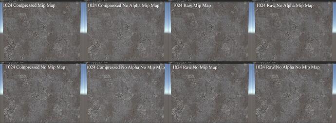 This is mip maps vs no mip maps between the different format settings. Main thing I’ve noticed (at least with this material) is the different between no alpha and alpha is that the no alpha version is a bit lighter. Obviously up close no mip maps is higher quality, but there’s an issue with this I’ll get to later.