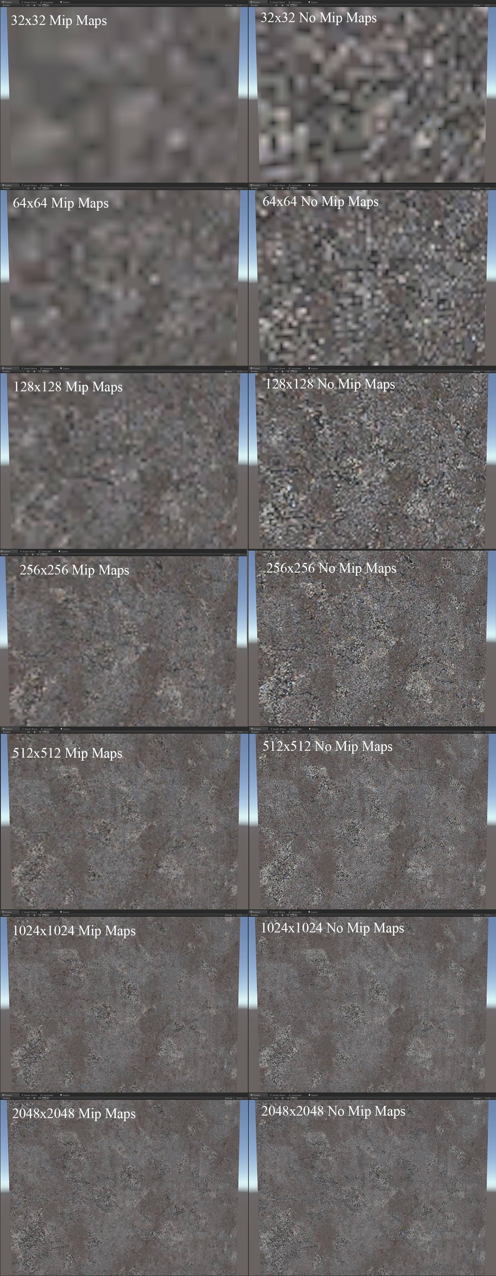 With mip maps it seems like the highest quality version of the textures ends up blurred, even if you’re very close to it. If there’s a way to mess around with mip map distancing, I haven’t found it. Best I can do is, when making LODs, add different variations of a material to each LOD. Mip maps on distance LODs, no mip map on the very closest LOD on very specific objects, but it’s not always great and I’d rather not have each LOD for an object require its own material if I can get away with it, you know?