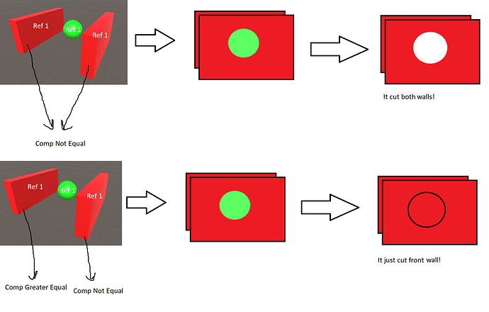 This works. However, also walls behind the player will be made transparent. So I tried to add a ZTest to the sphere shader: Just set the StencilBuffer if ZTest is GEqual. Sadly if I do this no wall ever will be transparent. I am quite sure the reason is: Sphere_Shader is running at Geometry-1. So there is no Geometry to loose ZTest against. If I change it to Geometry+10 the StencilBuffer may be set correctly, but the wall is already drawn everywhere.