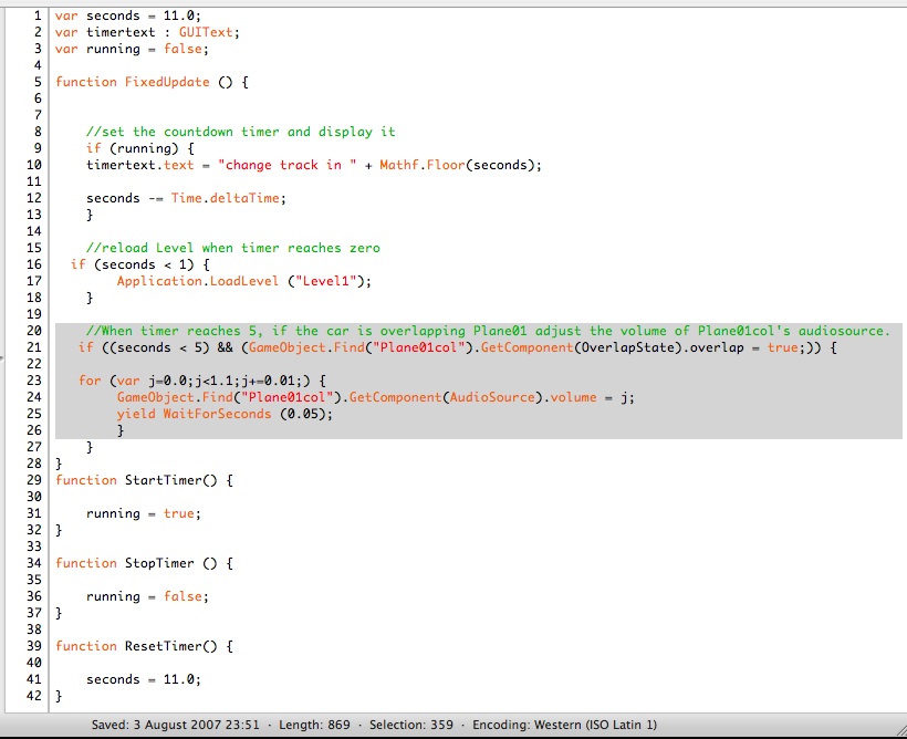 When the timer drops under 5 seconds, I dicrease the volume of the road’s audiosource and I increase the volume of another object’s audiosource. The loops in the script work like a crossfading process (Loops is the only way I know to fade in/out the audio!)