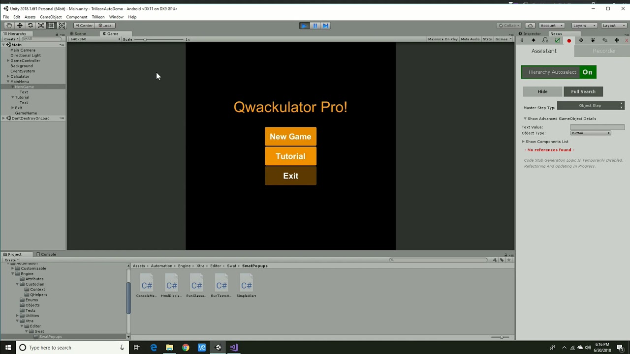 There are several Unity Editor Window tools included in Trilleon. For example, there’s the “Assistant” tool which allows inspection of elements in the hierarchy window of the editor. This displays all automation-relevant details, including links to the objects and scripts that reference it, and allows you to choose an action or assertion before generating code stubs that can be pasted into your tests. This code accounts for references to the selected game object, and provides a direct link to that reference. In cases where no references are found, a generic search script will use the finder functionality to locate it based on the requested attribute.