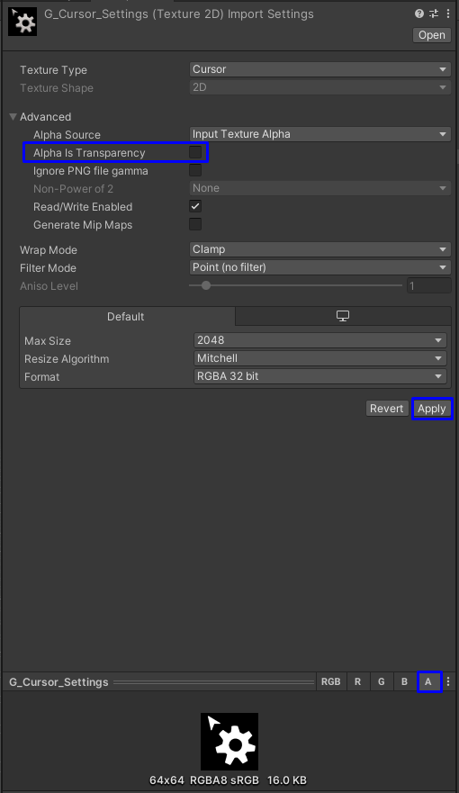 I am attempting to turn on the Alpha Is Transparency option for a 32 bit Targa image that is set to import as RGBA 32 bit. I can see that my image has an alpha because at the bottom it has the RGBA channels as selectable and I can see the alpha I created when I click on channel A. When I turn on Alpha Is Transparency then click Apply, the option always ends up becoming unchecked. I need this turned on because I am attempting to use this image as a Cursor and would like to get rid of the following warning from constantly popping up: