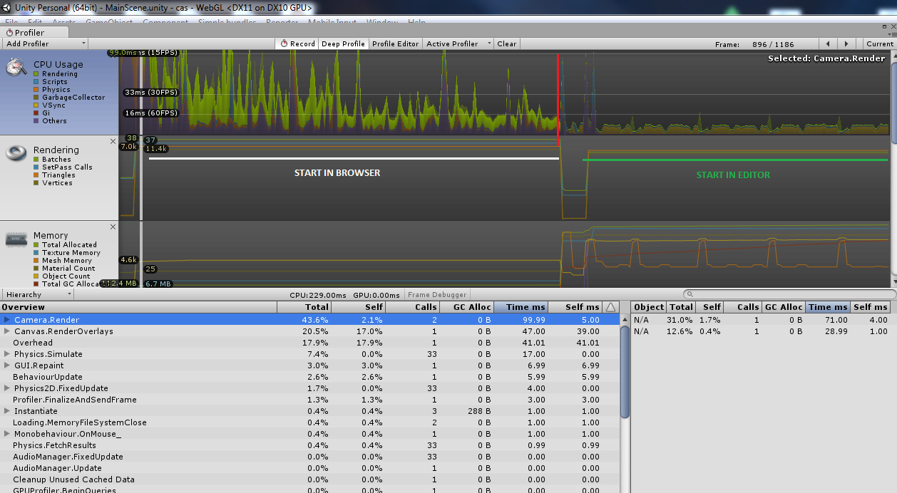 I have problem with building the application for WebGL platform, that is the FPS number is much lower than in editor (15-30FPS in browser; ~80 in editor - in the case of other scenes the diffrence is even higher). The main load comes from the renderer, and as I read in your documentation the GPU performance should be similar to that one of native version. Is such drop in framerate typical to WebGL? If not, could you tell me why it happens, and what I can do in order to fix this issue ? Please let me know if you want any additional info about the setup.