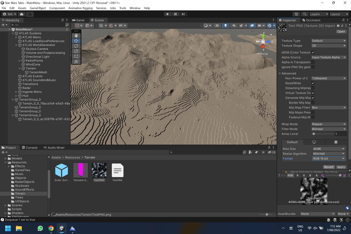 Setting the image to “RGB 16bit” and reading the “Grayscale” using unity’s terrain tools… causes stepping… in 2021.2.13f1… I presume this is some kind of bug.